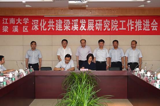 会上,陈卫代表学校对考察团的到来表示热烈欢迎,并从学校概况、社会影响、服务无锡、服务梁溪四个方面简要介绍了学校发展情况。梁溪发展研究院常务副院长吴锡生宣读了第一届理事会名单。随后,双方围绕附属实验学校、特色小镇文化提升、大学生创新创业服务、区域环境治理和“城市双修”示范区建设等方面分别签署了合作协议。会上,徐劼表示梁溪区高度重视与江南大学的合作,希望通过梁溪发展研究院进一步深化政产学研合作,并指出,要进一步优化理事会的运行机制,以项目为载体,建立常态化沟通机制;要突出重点合作领域,推动在食品、物联网、文化创意等方面形成定向的科研成果转移渠道;要进一步深化合作内容、整合资源,建好用好服务平台。朱拓对梁溪区长期以来给予学校发展的支持表示感谢,他指出,扎根无锡是我们的荣耀,服务无锡更是我们的使命。双方自去年共建梁溪发展研究院以来,开展了大量的工作,在食品、文创等领域取得初步成效。他要求,学校相关部门和学院要把握机会,主动对接梁溪区有关部门和企业,早出成果,多出成果,全力助推梁溪经济社会发展。