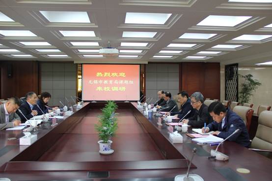 4月12日下午,无锡科技职业学院原党委书记曹建林等一行4人组成的无锡市教育局课题组来校调研,副校长吴正国及校长办公室(地方服务与合作办公室)、发展规划与重大项目办公室、社会科学处、学科建设处等相关部门负责人参加了会议。